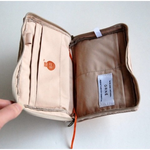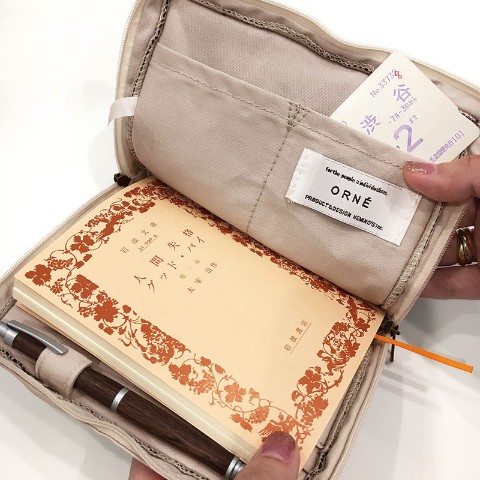 ポーチとしての使用はもちろん、文庫本などのブックカバーとしての機能も果たせるように、表紙を差し込めるベルト、その昔は文庫本自体についていたしおり紐、ペン差しの機能が加わり、充実した内装になっています。