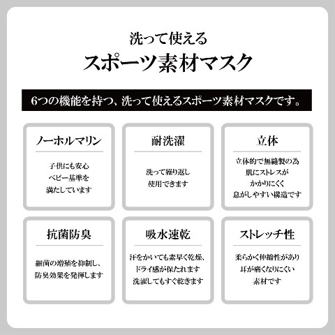 生地には洗って繰り返し使用できるスポーツ素材を採用しており、抗菌防臭・吸水速乾など多くの機能を備えています。