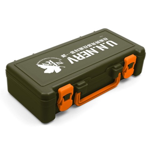 ハンドルとロックパーツを特注色のオレンジで製造し、筐体のカラーは自衛隊に採用されているオリーブドラブを特注し組み合わせるというこだわりの仕様となっています。