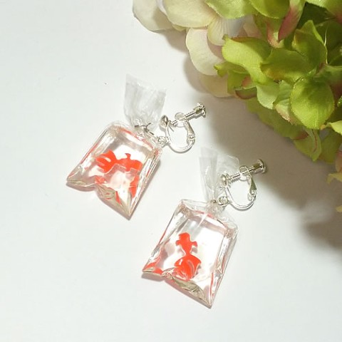 【#kawaiiiii!】夏祭りの想い出 イヤリング(金魚すくい)赤