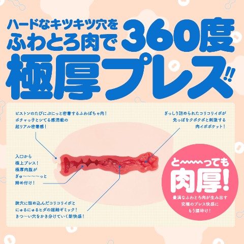 究極のキツマン!ずっしり肉厚670g!締め付けるハードな肉壁をやわらかソフト肉で360度プレスすることで実現した極上のキツマン!狭穴に詰め込んだ超細ギミックをかき分ける快感とふわぽちゃ肉に押しつぶされる快感をぜひ体験してください。直接肌に触れるものだから安心の国産素材&国内生産 MADE IN JAPAN 使うほどに成長する革命的素材「momochi」素材使用。パッケージイラスト:ぎうにう