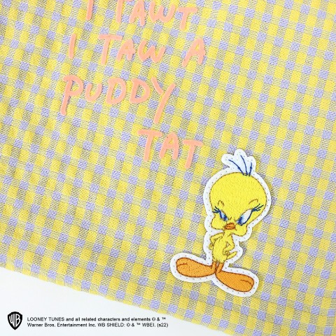 ルーニーテューンズの人気キャラクターを手刺繍風のワッペンで表現。オシャレ配色なギンガムチェックの生地がかわいい。使いやすいサイズの巾着ポーチ。