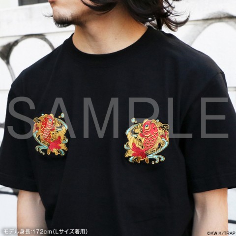 登場人物7名をモチーフにしたオリジナルイラスト「東卍亞仁魔流」(トーマンアニマル)シリーズの刺繍Tシャツ。金魚(武道)、鳳凰(マイキー)、龍(ドラケン)、ライオン(場地)、黒猫(千冬)、白蛇(三ツ谷)、虎(一虎)のイラストはイラストレーターのギブミ~!トモタカさんに制作していただきました。