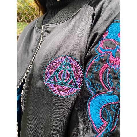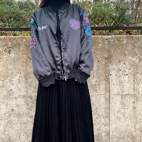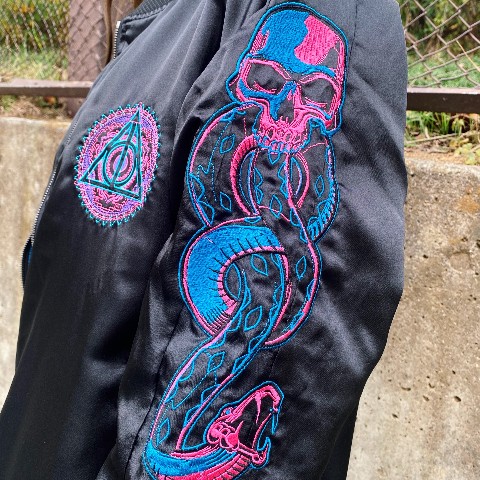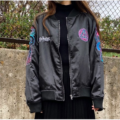 映画『ハリー・ポッター』に登場する闇の生物「ディメンター」モチーフのスカジャンです。ディメンターを連想する黒色にグリンデルバルドのマークがワンポイントになっています!背中側にはディメンターがデザインされています。