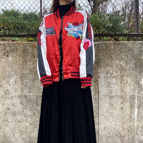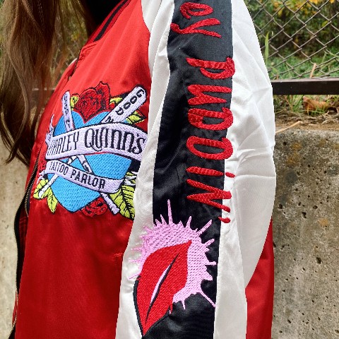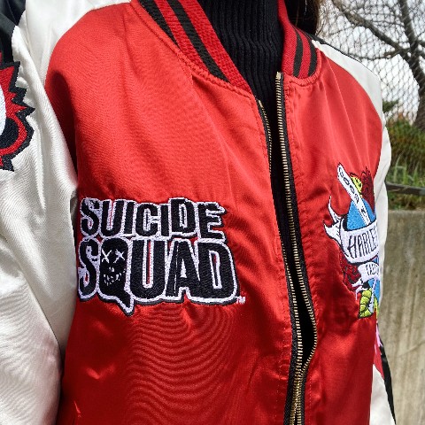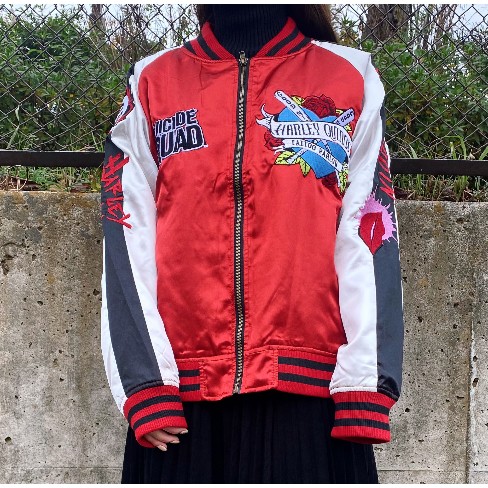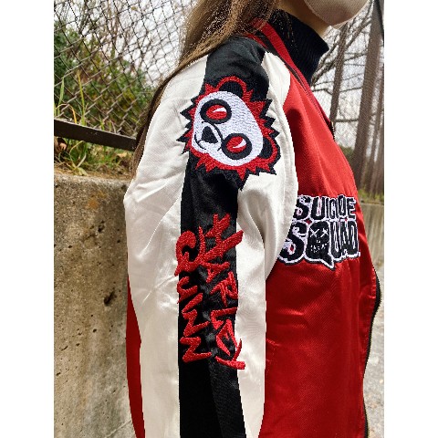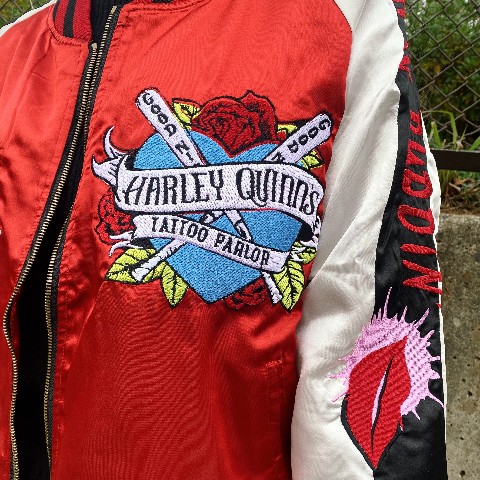 派手でキュートな、ハーレイ・クインデザインのファンにはたまらないスカジャンです。