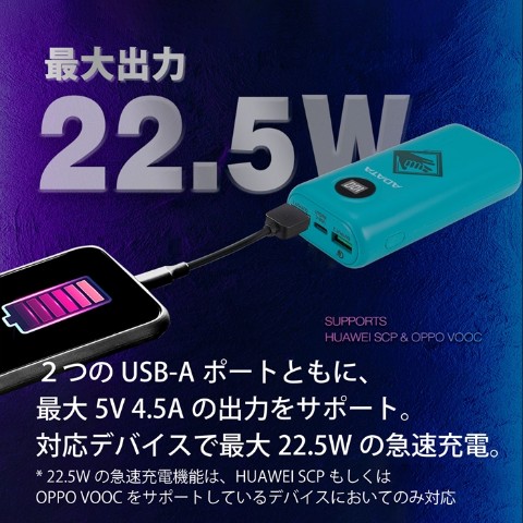 USB-Aポートは、最大5V 4.5Aの出力をサポート。対応デバイスならば最大22.5Wの急速充電を実現します。