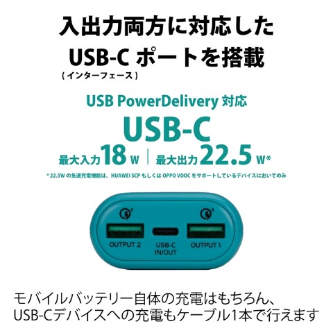 USB-Cポートは、入出力両方に対応。モバイルバッテリーへの充電も、USB-C機器への充電もケーブル1本で簡単に行えます。