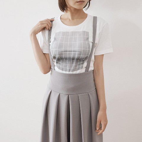 人々がこっそり思い描いている妄想世界を実現するTシャツ。エコードワークス独自の妄想マッピング技術により、フロントにあしらった格子模様を視覚的に拡張し、偽りのボリューム感を演出します。これであたなも人々の注目を集めること間違いなし!?…というコンセプトの「胸元が膨らんで見える風」プリントTシャツです。