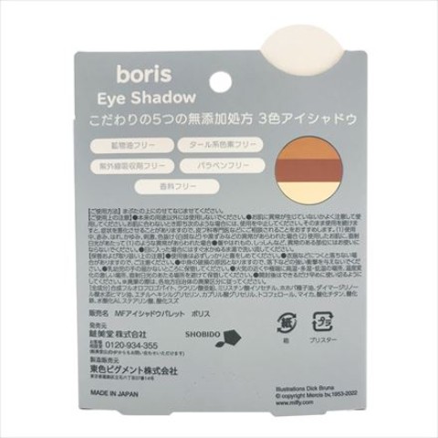 ミッフィーとボリスのナチュラルカラーシリーズ。5つの無添加処方の3色アイシャドウパレットです。〈鉱物油フリー・有機色素フリー・紫外線吸収剤フリー・パラベンフリー・香料フリー〉