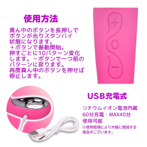 60分充電で最大40分使用可能なリチウムイオンバッテリー充電式バイブ。