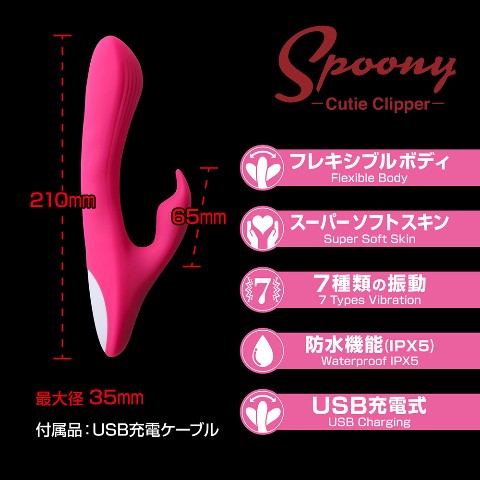 ふわふわもちもちした独特の滑らかなボディは、優しい感触を女性に与えます。グレードの高いシリコン素材を採用し、安全面・衛生面にも配慮しています。最大の特徴は自由自在に曲がるフレキシブルなボディです。好みのポジションにピッタリとフィットさせ、自分だけのプレジャータイムをお楽しみいただけます。このCutieClipperは2本の指の様なサブバイブが特徴です。ポイントを挟む様に振るわせ、内と外からの刺激をお楽しみいただけます。7種類の振動を備えており、好みに応じて楽しむことが可能です。防水機能(IPX5)を備え、使用後は水洗いが可能です。カラーはヴィヴィッドで品のあるピンクを採用し、女性心をくすぐるデザインに仕上げました