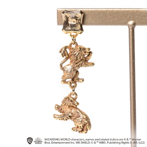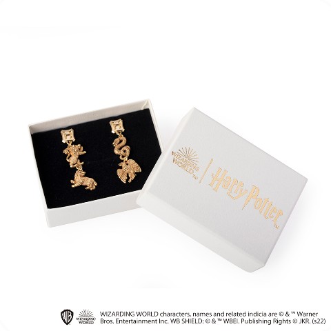 ホグワーツ魔法魔術学校の頭文字と、4つの寮を象徴する動物をモチーフにしたピアス。動物の配置は校章とリンクしており、左上から反時計周りに「グリフィンドール/ライオン」、「ハッフルパフ/アナグマ」、「スリザリン/サーペント(大蛇)」、「レイブンクロー/ワシ」があしらわれています。全体のカラーを落ち着きのあるゴールドで仕上げました。耳元を上品に彩ります。