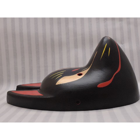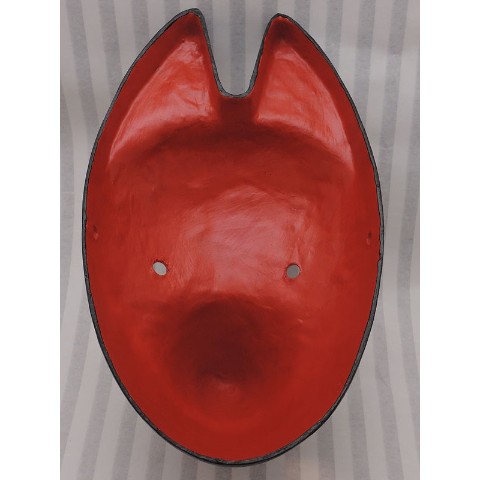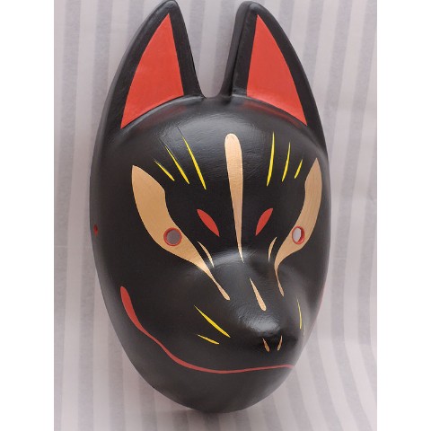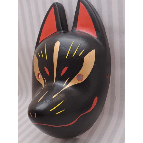 黒地に大きな金の目が特徴の、顔全体を覆う総面でございます。
