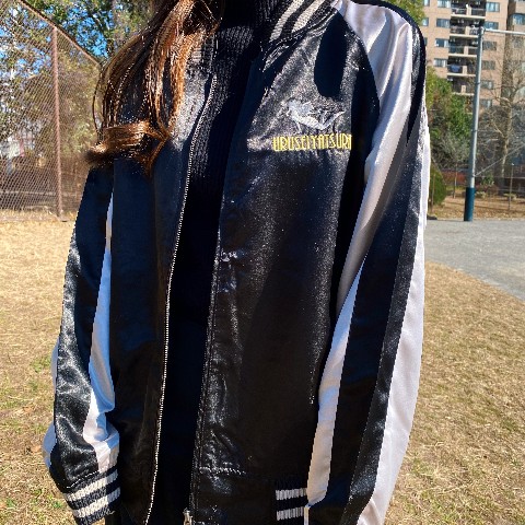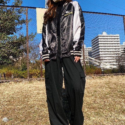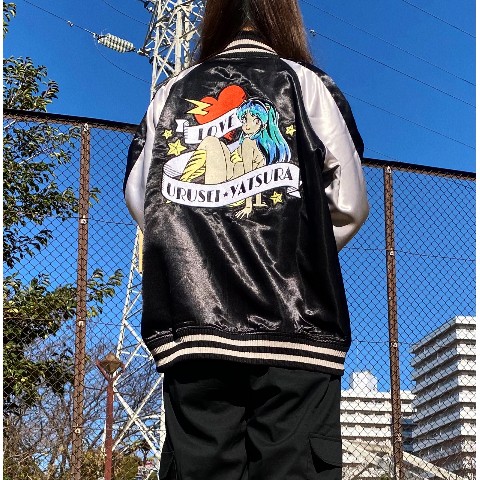 ””背中にラムちゃん柄の刺繍を施したスカジャン。春の新商品で、サイズはメンズサイズです。