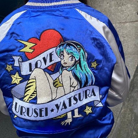 ””””””””背中にラムちゃん柄の刺繍を施したスカジャン。春の新商品で、サイズはメンズサイズです。