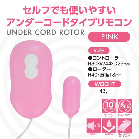 握れば分かる使いやすさがウリのアンダーコードスタイル。コードがコントローラーの下側から出ているのでセルフプレイの時も通常時もコードの煩わしさが軽減されたスタイリッシュデザインローター登場。単四電池3本を使用した4.5Vの強力振動マイクロモーター搭載の小径ローターに可愛いカラーバリエーション、さらにマット加工を施し、上質を極めた新型ローターです。10パターンアクション・ワンプッシュで簡単にON/OFF操作可能です。