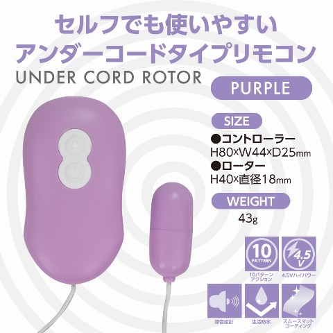 握れば分かる使いやすさがウリのアンダーコードスタイル。コードがコントローラーの下側から出ているのでセルフプレイの時も通常時もコードの煩わしさが軽減されたスタイリッシュデザインローター登場。単四電池3本を使用した4.5Vの強力振動マイクロモーター搭載の小径ローターに可愛いカラーバリエーション、さらにマット加工を施し、上質を極めた新型ローターです。10パターンアクション・ワンプッシュで簡単にON/OFF操作可能です。
