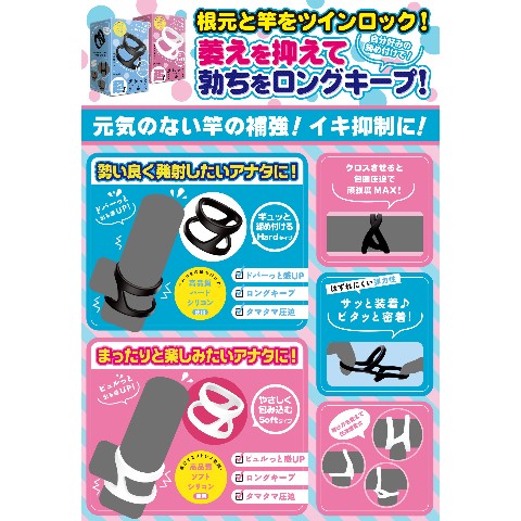 超!ぷにっとりんぐから根元と竿元に簡単装着が出来るツインロックハードverが登場。サッと装着♪ピタッと密着!はずれにくい弾力性、臭いのない高品質シリコンで根元と竿元をしっかり締め付け、着けてるストレスを軽減!すべすべ装着感で毛の巻き込みを緩和。 挟み込んだり押しだしたりタマタマ圧迫の使い方も色ー。着け方を変えて圧迫感も変化♪ 自分好みの締め付けで、勃ちの維持!萎え気味の竿の補強!イキ抑制!クロスさせると包囲圧迫で頑強度MAXに!ハードな締めつけでドバーっと出る感UP♪きゅーっと超極楽発射!検査番号:2205489