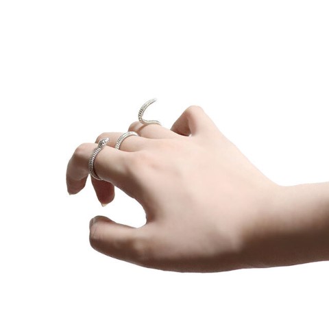 蛇が指にからみついたようなモチーフで、装着方法を楽しめるデザイン。