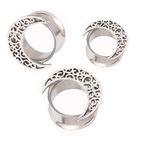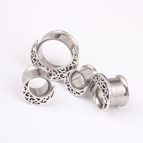 ダブルフレアタイプのフレッシュトンネルホールに繊細な透かし柄の月モチーフが付いたBODYpieace