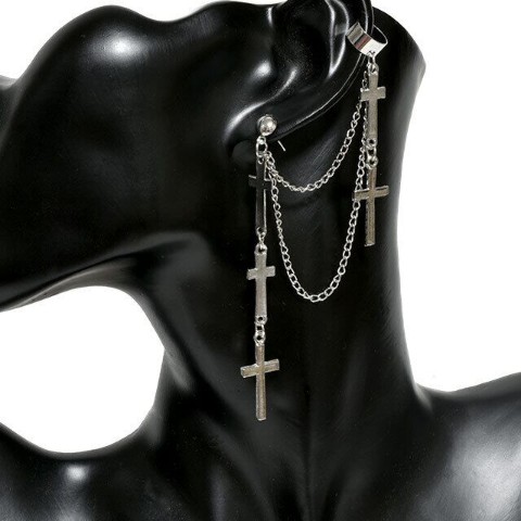 イヤーカフとピアスがチェーンで繋がってゆらゆら揺れる、クロスモチーフのピアスです。