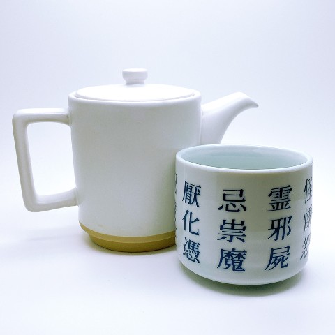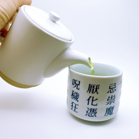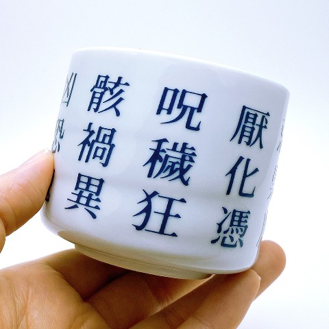 禍ーしい漢字で構成された、青磁の湯呑みです。陶器ならではの重量感があります。