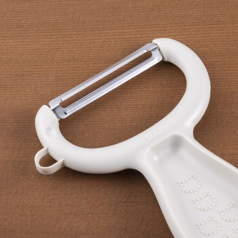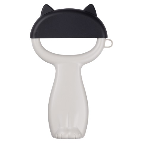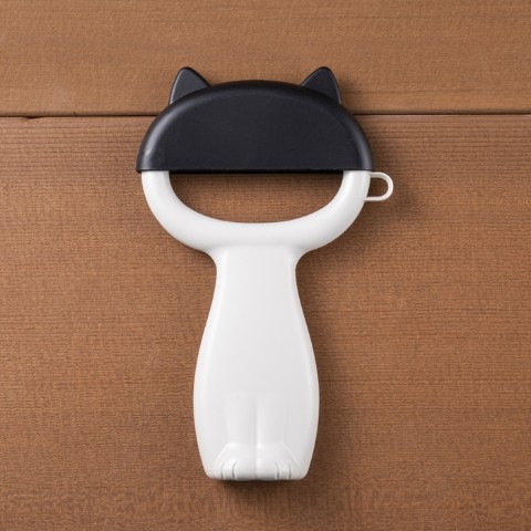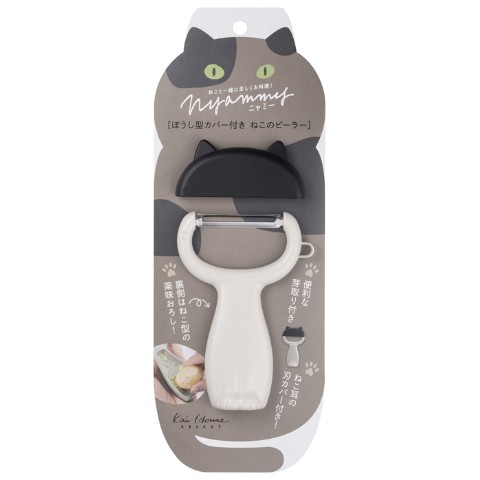ネコがちょこんと座ったシルエットをモチーフにしたピーラーです。便利な芽取りはもちろん、裏側は薬味おろしに使えます(おろし金の形もネコなんです!)ネコ耳のぼうし型カバー付きで、収納時の安全性を高めています。