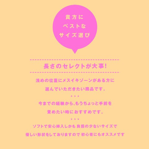 貴方にベストなサイズ選び、長さのセレクトが大事!浅めの位置にメスイキゾーンがある方に選んでいただきたい商品です。