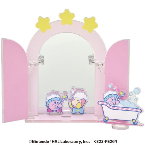 カービィたちのリラックスバスタイムをイメージしたアートワーク「カービィ・スイートドリームス」のイラストが、アクリル製の組み立てキットになりました。組み立てると手のひらサイズのスタンドミラーになり、扉を開閉したり、実際に姿を映して使うことができます。