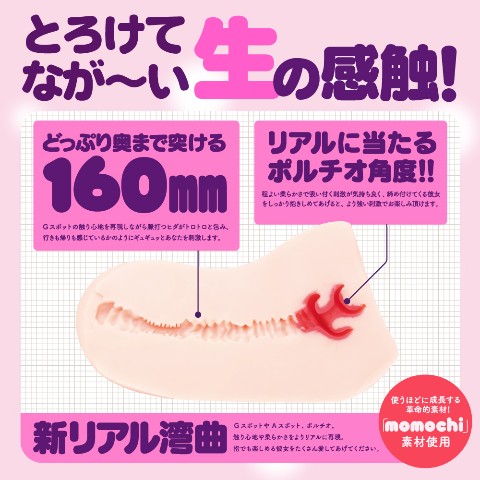 根元までたっぷり味わえる80→160長さがUP、さらにずっしり感じる重量UPの新サイズ、触り心地が違うGスポットとAスポット、リアルに当たるポルチオ角度、波打つ肉壁、素材もこだわった「ふんわり柔肌とろけてなが~い生の感触」。