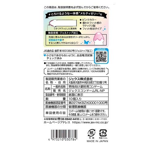 締め付けないフィット形状、優れたフィット感のラテックス製、女性側にやさしいジェルトップ加工、水溶性ゼリーたっぷりでなめらかな使用感、ピンクカラー、10個入り。