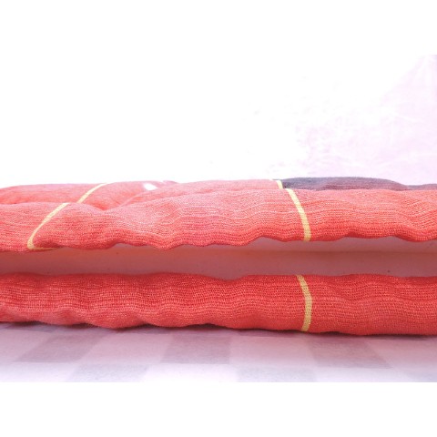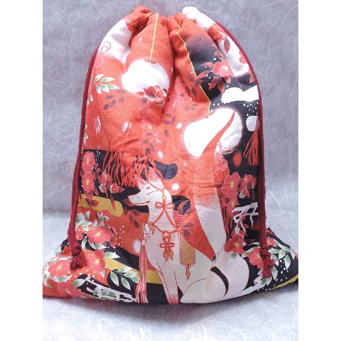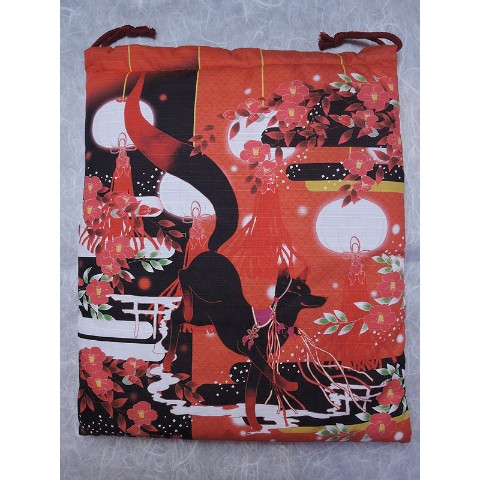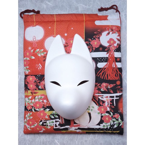 生地は綿を100%使用したシャンタンと言う織り方で、風呂敷などにも使われます。軽やかで、和風の風合いを出すのに適している生地です。巾着の内部には綿が仕込まれていて、衝撃を吸収しやすくなっています。狐面を持ち運びたい際の入れ物としてご利用いただけます。