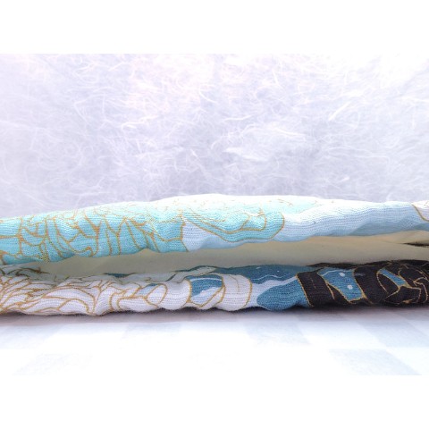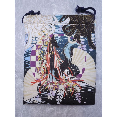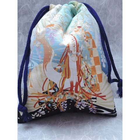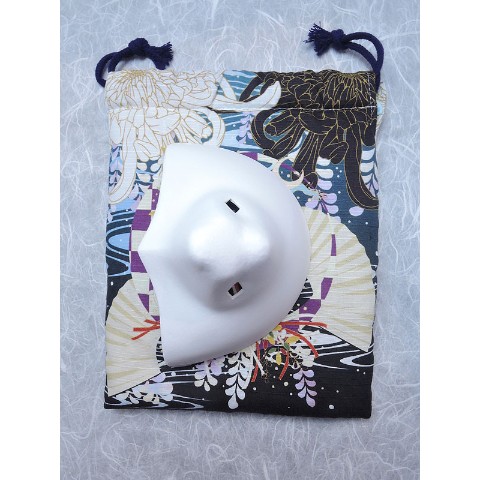 生地は綿を100%使用したシャンタンと言う織り方で、風呂敷などにも使われます。軽やかで、和風の風合いを出すのに適している生地です。巾着の内部には綿が仕込まれていて、衝撃を吸収しやすくなっています。狐面堂の狐口面に対応したサイズとなっており、持ち運びたい際の入れ物としてご利用いただけます。