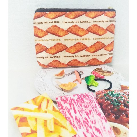 人気の焼肉柄のポーチをセットにしました。そのほか、ピアス、キーチャーム、ヘアアクセサリーなども含みます!ぷっくり立体感もあるのでおいしそう♪