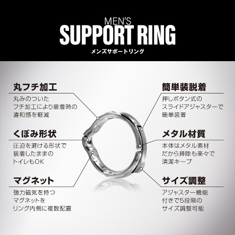 男のプライドをサポートする5段階調整可能なリングです。24mmから26mmサイズが新登場!!装着したままでトイレも行えるくぼみ形状、スライドアジャスターで簡単装着、メタル素材なので丸洗いで清潔キープ。通常時26mmから29mmタイプと29mmから32mmも含めた3サイズから選べる驚きの大変身を体感して下さい。