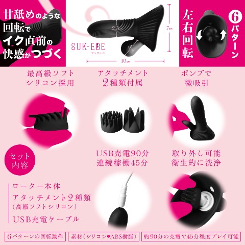 優しく舐めるから、イク直前の感覚がつづく。それが「ヤバ回転ローターNEBURINGUS-ネブリングス-」です。強い振動ばかりに慣れていると感度が鈍くなりませんか?今こそ優しくせつなく敏感な部分を「ねぶり」ましょう。敏感なアソコも胸もどちらもOK!!最初に使うときはお好みのアタッチメントを装着してからご使用ください。極限まで柔かくした高級シリコンブラシが優しく回転して刺激します。(薄めのローションをつけると滑りが良くなります)焦らされるような独特の感覚が、オーガズム直前のもどかしさを再現。左右回転6パターンで飽きさせません。優しさを演出するために敢えて「微」吸引ポンプも設置。ポンプのプッシュでもどかしい吸い付きが更なる焦らしを演出。しかも交換用アタッチメントつきで楽しさ2倍。【セット内容】ローター本体/アタッチメント(高級ソフトシリコン)/USB充電ケーブル。滑らかな感触をお求めの場合はローションをご利用ください。・6パターンの回転動作・約90分の充電で45分程度楽しめます