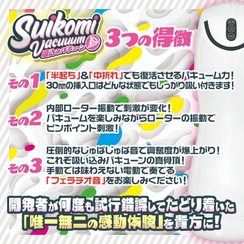 オナホールのバキュームとは全く違う。電動ポンプ並みの吸引が襲う!圧巻のバキューム体験!吸い込み過ぎてあそこがバキューン!の「SUIKOMIバキューン」の登場です。【電動ポンプの吸い込み力】×【振動】は吸い込みパターンの変化や振動パターンの変化で何度使っても新鮮な気持ちで楽しめます。いつでもプレイ(後処理ラクラク)が可能で場所(携帯可能)も問いません。手がベタつきにくい(直接触らない)。電動だから固定して、ボタン操作だけで自動で動きます。上下運動したり、捻じったり、傾けたり、回転させたり、擦りつけたり。深く入れたり、先端だけ刺激したり、フェラチオ耐性強化にも使えます。静穏設計。らくらく後処理。ロングプレイに最適です。【パーフェクトフェラチオマシーン】とでも言うべきなのか?是非ともお試しいただき、この吸い込み、この刺激を体験していただきたい。リラックス時間にどうぞお楽しみください。※ハマりすぎにはご注意ください。maccosHPで動画公開中※本品はジョークグッズですので、その他の目的でご使用された場合の責任は一切負いません。
