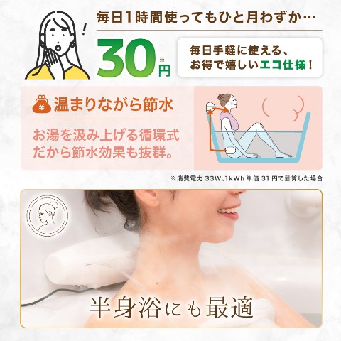 「極楽かた~ゆ」お金のかかる配線工事などは不要で、お風呂に簡単に後付けすることができます。至福のバスタイムで心身ともにリフレッシュして、新しい一日に向けて活力を取り戻しましょう。