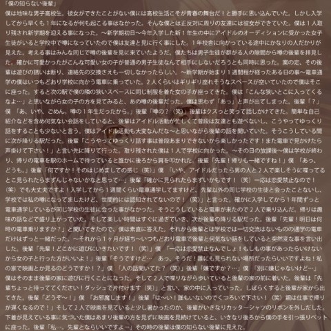 僕の知らないシリーズ第二弾!「極上の快感を追求した縦ヒダ構造のオナホール」ハサミのような形状をした独特な縦ヒダが極上の快感をもたらす!さらに細かい横ヒダがジョリジョリ感を引き立て一度使用すれば虜になる!柔らかい素材で心地よい刺激がまったり楽しめる!「僕の知らない後輩」僕は地味な男子高校生。彼女ができたことがない僕には高校生活こそが青春の舞台だ!と勝手に思い込んでいた。しかし入学してから早くも1年になるが何も起こる事はなかった。そんな僕とは正反対に周りの友達には彼女ができていた。僕は1人取り残され新学期を迎える事になった。 ̄新学期初日 ̄今年入学した新1年生の中にアイドルのオーディションに受かった女子生徒がいると学校中で噂になっていたので僕は友達と見に行く事にした。1年校舎に向かっている途中にかなりの人だかりが見えた。考える事はみんな同じで噂の後輩を見に来ていたようだ。僕たちは男子生徒が群がる人の隙間から噂の後輩を拝見した。確かに可愛かったがこんな可愛い女の子が普通の男子生徒なんて相手にしないだろうとも同時に思った。案の定、その後輩は遊びの誘いは断り、連絡先の交換さえも一切しなかったらしい。 ̄新学期が始まり1週間程が経ったある日の事 ̄電車通学の僕はいつもどおり学校に向かう電車に乗っていた。2人くらいはギリギリ座れそうなスペースが空いていたので僕はそこに座った。すると次の駅で僕の隣の狭いスペースに同じ制服を着た女の子が座ってきた。僕は「こんな狭いとこに入ってくるなよ…」と思いながら女の子の方を見てみると、あの噂の後輩だった。僕は思わず「あっ」と声が出てしまった。後輩「?」僕「あ、いや、ごめん。噂の1年生だったから。」後輩「噂の?(笑)」後輩はクスっと笑って話しかけてきた。簡単な自己紹介などを含め何気ない会話をしていると、後輩はアイドル活動が忙しくて普段は友達とも遊べないし、こうやってゆっくり話をすることも少ないと言う。僕はアイドル活動も大変なんだな ̄と思いながら後輩の話を聞いていた。そうこうしている間に次が降りる駅だった。後輩「こうやってゆっくり話す事は普段あまりできないから楽しかったです!また電車で見かけたら声掛けて下さい!」と言い先に降りて行った。取り残された僕は1人で学校に向かった。 ̄その日の放課後 ̄僕は学校が終わり、帰りの電車を駅のホームで待っていると誰かに後ろから肩を叩かれた。後輩「先輩!帰りも一緒ですね!」僕「あっ、どうも。」後輩「何ですか!そのはじめましての感じ(笑)」僕「いや、アイドルだったら男の人と2人で楽しそうに喋ってるとこ見られたらまずんじゃないかなと思って…」後輩「確かに見られたらまずいかもです!(笑)一応は恋愛禁止なので!(笑)でも大丈夫ですよ!入学してから1週間くらい電車通学してますけど、先輩以外の同じ学校の生徒と会ったことないし、学校では私の噂になってましたけど、世間的には認知されてないので!(笑)」と言った。確かに入学してから1年間ずっと電車通学しているが同じ学校の生徒に会った事がなかった。そうこうしていると電車が来たので2人で乗り込んだ。帰りは趣味の話などで盛り上がっていた。そして楽しい時間はすぐに過ぎていき、次が後輩の降りる駅だった。後輩「先輩!明日は何時の電車乗りますか?」と聞いてきたので、僕は素直に答えた。それから後輩とは学校では一切交流はないものの通学の電車だけはずっと一緒だった。 ̄それから1ヶ月が経ち ̄いつもどおり電車で後輩と何気ない話をしていると突然変な事を言い出した。後輩「先輩!どこかに遊びにいきたいです!(笑)」僕「一応は恋愛禁止なんでしょ!もしもの事があったらいけないから女の子と行った方がいいよ!」後輩「そうですけど…あっ、そうだ!誰にも見られない場所だったらいいですよね!私の家で映画とか見るのどうですか!?」僕「人の話聞いてた?(笑)」後輩「嫌ですか?…」僕「別に嫌じゃないけど…」僕はそのまま後輩の家に遊びに行くことになった。そして2人で喋りながら歩いていると後輩の家の前に着いた。後輩は「先輩ちょっと待っててください!ダッシュで片付けます(笑)」と言い、家の中に入っていった。しばらくすると後輩が家から出てきた。後輩「どうぞ ̄!」僕「お邪魔します!」後輩「は ̄い!誰もいないのでくつろいで下さい!(笑)親は仕事で帰りが遅くなるので!」そして2人で映画を見ていると少し暑かったのか、後輩がいきなりカッターシャツのリボンを外しだした。下着が見えている事に気づいた僕はあまり後輩の方を見ずに映画を見続けていると、いきなり後ろから僕の手を引っ張りベットに座った。後輩「私…。先輩とならいいですよ…」その時の後輩は僕の知らない後輩に見えた。