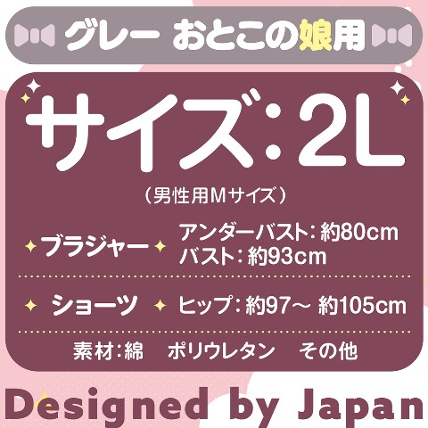おとこの娘専用にデザインした本格的ブラ&ショーツセット おとこの娘のお洒落は下着から? グレーのスポーツブラが魅せるパフォーマンス 優しいフィット感で長時間付けても心地いい♪ いやな締め付け感のないストレスフリー 綿混素材で心地よい肌ざわり みんな大好きなグレーのスポブラ おとこの娘用2Lサイズ Designed by Japan ◆サイズ2L(男性用Mサイズ) 【ブラジャー】 アンダーバスト:約80cm バスト:約93cm カップ:Bカップ 【ショーツ】ヒップ:約97~約105cm 素材:綿 ポリウレタン その他