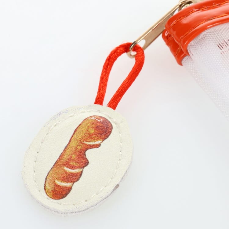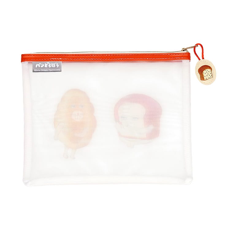 透け感がかわいいメッシュ素材のフラットポーチ。ポーチにはパンどろぼうとにせパンどろぼうがプリントされ、パンのファスナータブつき。A5ノートが入るサイズ感でステーショナリーをまとめたり、旅行時にミニボトルやヘアブラシなどを入れるのにおすすめです。