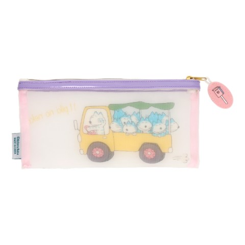 メッシュ素材のスリムポーチ。ペンや歯ブラシなどをいれるのに丁度いいサイズ。トラックに乗ったねこたちがかわいいデザイン。引き手もかわいい!