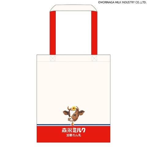 A4ファイルがすっぽり入る便利な大きさのトートバックです。森永のれん乳パッケージが全面にデザインされています。れん乳のチューブ型の紙タグ付きです。