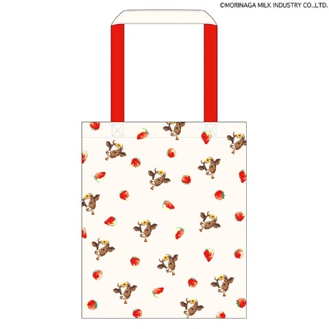 A4ファイルがすっぽり入る便利な大きさのトートバックです。森永のれん乳で有名な牛といちごがまだらにデザインされています。れん乳のチューブ型の紙タグ付きです。