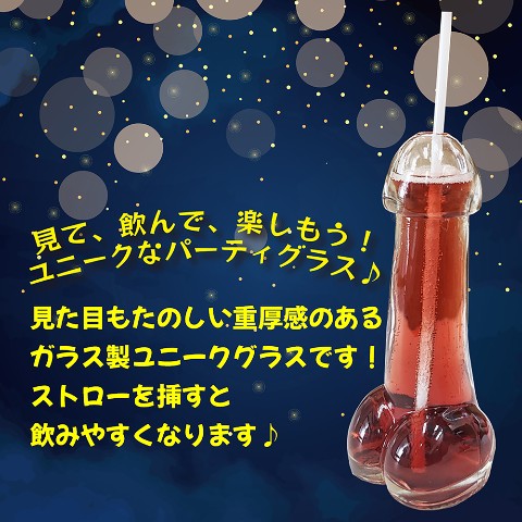 見て、飲んで、楽しんじゃおう!ユニークなかたちのパーティグラスです。厚めのガラス製ですので、ずっしりとした重みがあります。カクテルやジュースなどを入れれば、みんなでカンパーイ♪気分も盛り上がること間違いなし!飲む際は、ストローを挿すことで飲みやすくなります。一輪挿しとして、ホテルやお部屋のインテリアにするのもおすすめです。クスっと笑えるプレゼントにも!「パーCHINナイト」で朝まで楽しいパーティナイト!
