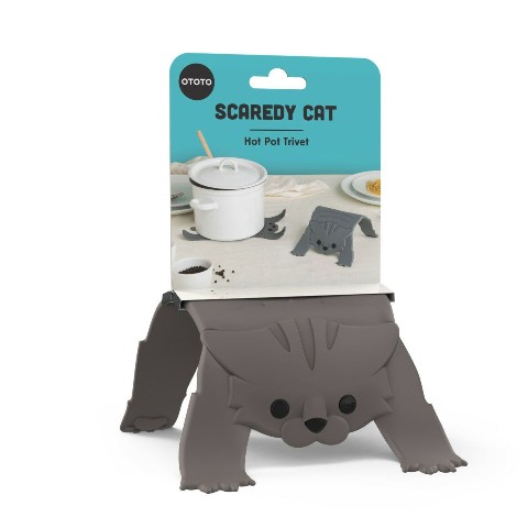 シャーっと威嚇しているネコは実は鍋敷き!ちょっと可哀想ですが、ねこちゃんの背中にお鍋を置くとぺっちゃんこになるおりこうさん。鍋パーティーに盛りあがりを添えてくれます。