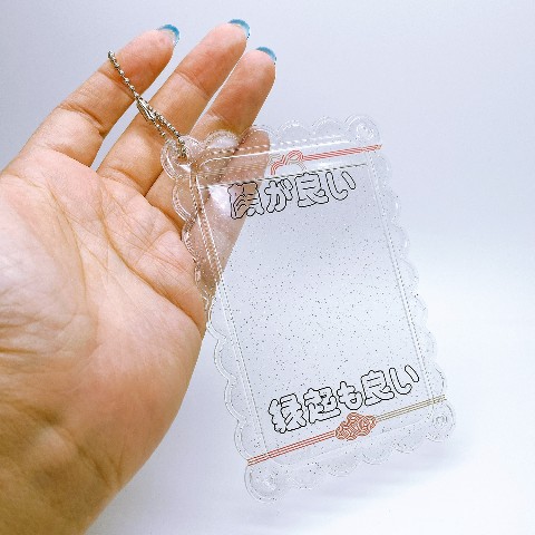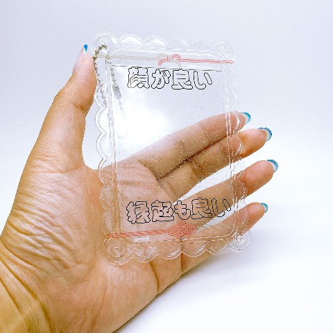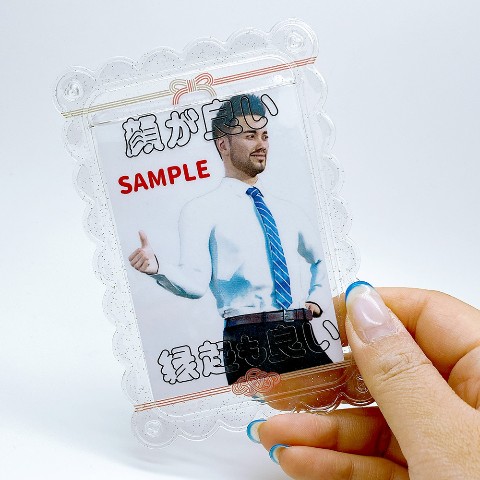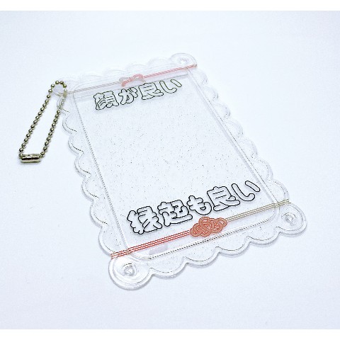 「顔が良い縁起も良い」の文字がデザインされた、おめでたい感じのフォトホルダーです。ボールチェーンをお付けしますので、製品上(左右)の穴に通してお使いください。クリアラメベースのシンプルなデザインなので、シール等のデコベースとしてもご使用頂けます。