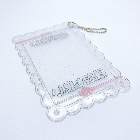 ※カードを長期間入れっぱなしにしていると、カードの印刷がフォトホルダーに移る可能性がございますのでご注意ください。 ※製品の四隅のパーツは指で押すと外れます、ボールチェーンを通したい部分のパーツを外してお使いください。