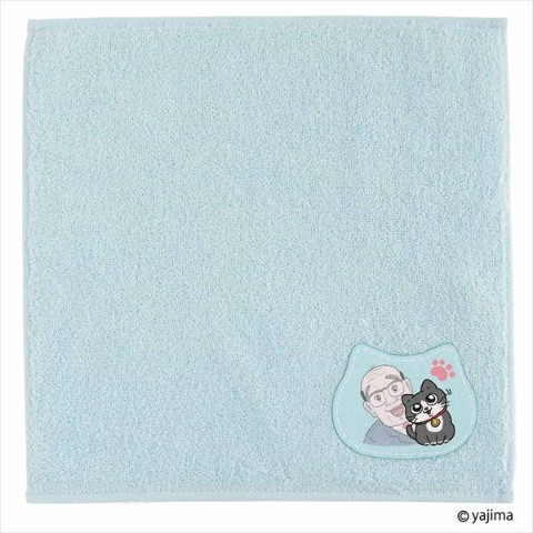 【ねこに転生したおじさん】タオルハンカチ プンちゃん&おじさん ブルー