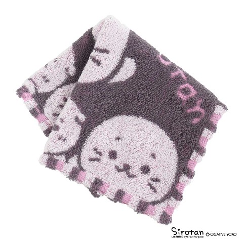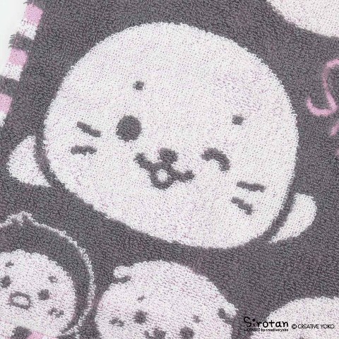 縞ーの縁取りから、しろたん・らっこいぬ・らむねが仲良くひょっこり顔を出した愛らしいデザインです。中央で挨拶をしている手を上げたしろたんに癒されます。